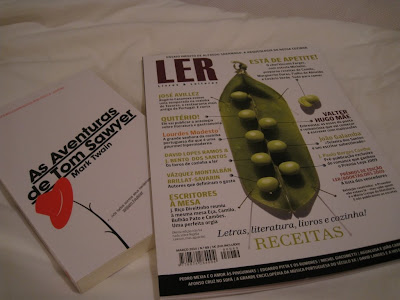 Adoro ler. Gosto (quem não gosta?...) de presentes, sobretudo os "surpresa", aqueles mimos que não estamos mesmo a contar. A minha mãe ofereceu-me há dias este número da revista Ler, cujo conteúdo do mês de Março é-me sem dúvida apelativo (todo dedicado ao mundo culinário!...), e também o famoso livro do Mark Twain, que apesar de ter devorado os respectivos desenhos animados (na minha infância), nunca li. Apropriado, pois como a minha mãe sabe, os meus filhos andam a deliciar-se com os mesmos episódios que me fascinaram em menina. Ainda hão-de ver a Heidi e já viram a Abelha Maia, que aquilo é que eram desenhos animados de jeito, pois então!...Mãe atenta, esta que eu tenho! Obrigada mãmã!....
