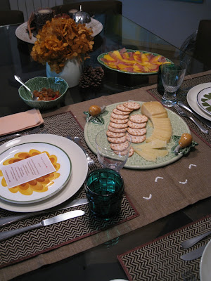 Esta mesa foi posta de maneira descontraída, mas nem por isso isenta de detalhes... Apetecia-me usar os individuais da Area, que deram um toque "étnico" à mesa. Mas porque mesas originais se fazem muitas vezes de misturas pouco habituais, a louça Bordalo Pinheiro também aqui deu um ar da sua graça. A minha queijeira Bordalo Pinheiro, que tem por "vigias" dois caracóis muito simpáticos, deu o mote para as restantes cores e peças utilizadas: chemin da Casa Alvarinho, copos de água da Marinha Grande, copos de vinho da Leonardo, serviço da Spal. Os pratinhos das entradas são todos diferentes e pintados à mão, herança de família. Para centro de mesa (que aqui foi propositadamente descentrado...) usei um bule que há muito tempo perdeu a tampa, mas que fica lindamente a servir de jarra a flores e dá um toque muito original! Neste caso, umas hortênsias secas de cor amarela e umas pinhas ajudaram a criar a atmosfera outonal e a ligar todas as cores da mesa!...