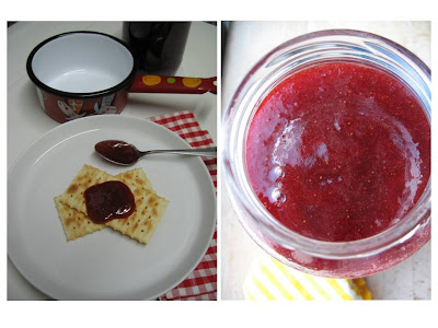 No "outro" blog da colher-de-pau, vi, certo dia, que havia morangos em promoção no hipermercado a que costumo ir. Fiquei com a sugestão debaixo de olho, e não tardei a, na visita seguinte ao dito espaço, trazer umas caixas de morangos para fazer compota. Foi a primeira vez que fiz compota de morango e acho que ficou deliciosa!!!! Fui buscar inspiração para a receita no livro "Doze Meses de Cozinha", da Selecção dos Reader's Digest.